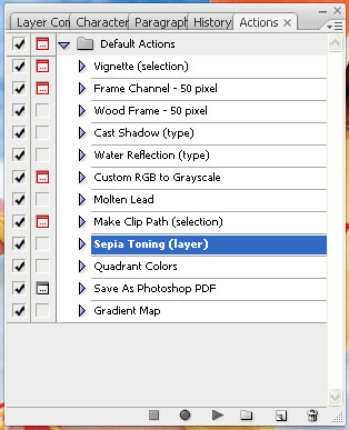 On the “Actions tab” , choose Sepia Toning (grayscale) or Sepia Toning (layer) from the Image Effects group. Choosing this method, you will see 3 layers in the Layers window. By selecting the uppermost layer and changing the value of Opacity, you can control the sepia effect on the picture.