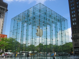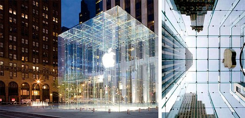 El famoso Cubo de vidrio de la Quinta Avenida es una de las más emblemáticas construcciones de Apple. El emplazamiento del Apple Store en la 5ta Avenida de New York constituye la tienda más innovadora de la compañía; con su distintivo cubo de cristal de casi 10 metros de lado crea un efecto descollante en el epicentro de una de las zonas comerciales más populares del mundo.