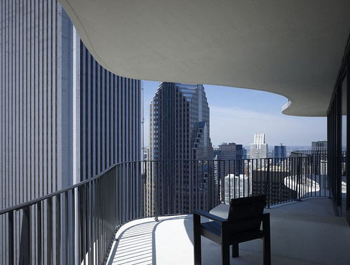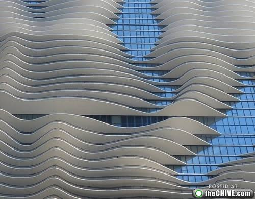 Para ofrecer grandes vistas de los lugares adyacentes más emblemáticos a los residentes de Aqua, Gang extendió los balcones hacia el exterior hasta 12 pies (3,7 metros). El resultado es un edificio compuesto por losas de concreto de forma irregular, que nos muestran una fachada ondulante de una calidad escultórica. La arquitecta Jeanne Gang cita a los afloramientos de piedra caliza estriada que son una característica topográfica común de la región como la fuente de inspiración para este tipo de losas.