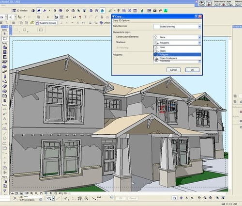 ArchiCAD permite trabajar al usuario con representaciones 2D o 3D en pantalla. Los diseños en “Dos dimensiones” pueden ser exportados en cualquier momento, incluso en el modelo; la base de datos siempre almacena los datos en “Tres dimensiones“. Planos, alzados y secciones son generados desde el modelo del edificio virtual de tres dimensiones y son constantemente actualizados.