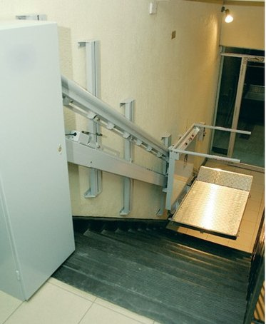 Hay elevadores de minusválidos para escaleras, donde se instalan al lado de la pared del edificio, por lo que hay un espacio especial para poner una silla para poder subir al minusválido, y la otra parte de la escalera deja un espacio libre para poder subir a pie.
