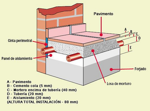 En un sistema típico de calefacción radiante podemos observar una red de tubos de polietileno reticulado aprisionados entre el forjado y el pavimento, en una capa de mortero de aproximadamente 10 cm. de espesor, sobre el estándar de 5 cm. de mortero de nivelación típico para colocación de pavimento, que al estar en contacto con los tubos actúa como difusor secundario.