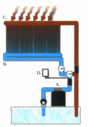 – El agua de la piscina o jacuzzi entra a los paneles solares, cuando el agua pasa a través del panel es calentada por la energía radiante del sol.