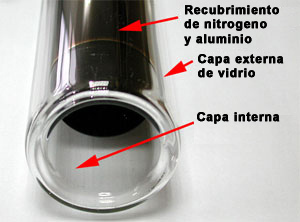 – Los calentadores solares tubulares de consisten en dos o tres tubos, dos interiores de metal y uno exterior de vidrio, generalmente concéntricos. Entre el tubo de vidrio y el tubo metálico externo, que debe ser negro (y puede ser de cobre) se hace el vacío , ya que la forma tubular permite que los tubos soporten grandes presiones, así como captar la mayor cantidad de radiación solar.