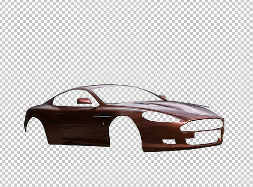 Con la nueva capa seleccionada, volvemos al panel canales, y vamos haciendo Control Click en la siguiente capa creada, como la que corresponde a las ventanas y una vez hecha la selección, pulsamos la tecla suprimir Esto, hay que hacerlo con todas las selecciones que hayamos hecho (morro, faros, logo de AM, etc) y al final, si ocultamos la capa fondo, deberíamos tener algo así: