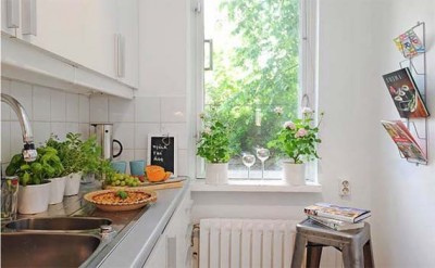 10- Agregue accesorios como plantas, obras de arte y recipientes atractivos sobre el mostrador. Elija plantas en macetas pequeñas, tales como margaritas o dracenas, que no requieren de mucho cuidado, pero ayudará a darle vida a su estrecha cocina. Compre frascos pequeños de colores brillantes o etiquetados con elegancia, como las de azúcar y la harina, y colóquelos en la pared en una esquina. Como consejo final, lo más importante en este tipo de cocinas no es tanto el espacio disponible sino la manera en que uno mismo sepa como organizarla.