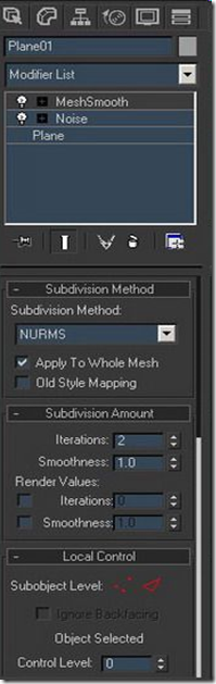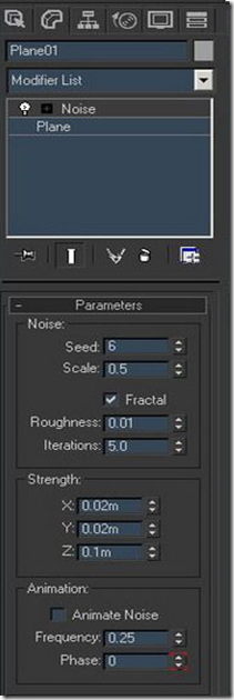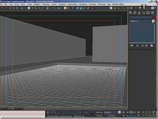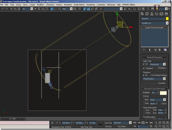 Para simular las ondas en el agua, metemos al plano un poco de ruido, y luego un meshsmooth para suavizarlo, y ponemos una luz direct con sombras VRayShadow.