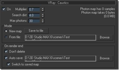 Ahora nos queda una cosa así. Solo resta meterle las cáusticas. Nos vamos al panel correspondiente de VRay y marcamos tal que así. (Aqui estan algunos parametrosos ..jugemos un poco con ellos hasta que consigamos el resultado que más nos guste). Eso sí……las pruebas llevan su tiempo.