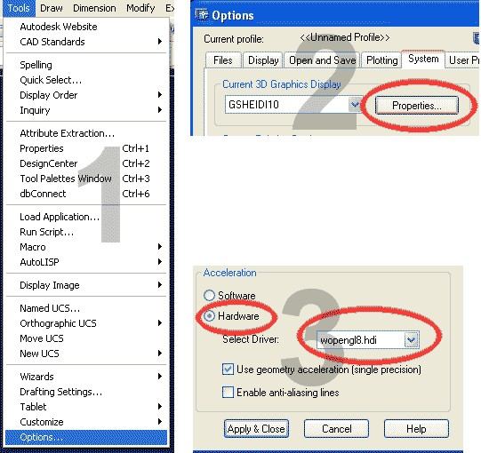 En el siguiente cuadro, abajo a la derecha, Bajo el titulo Acceleration , selecciona la opcion Hardware , Luego a la derecha del titulo Select driver , baja la flecha y/o ubica el driver Wopengl8.hdi