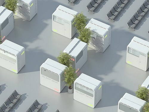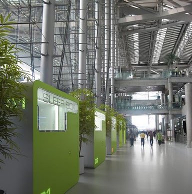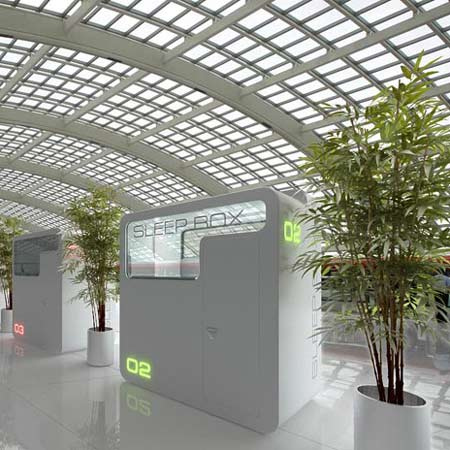Sleepbox es, como su nombre lo indica, unapequeña caja de 2m x 1,40m x 2,30m para dormir con confort y seguridad. Ofrece momentos de sueño tranquilo y descanso en la ciudad, sin pérdida de tiempo buscando un hotel.