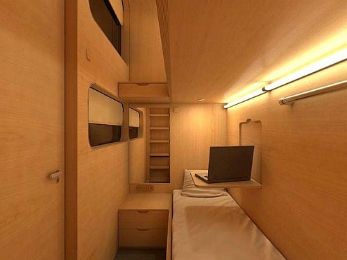 la firma de arquitectura rusa Arch Group, diseñó el prototipo para esta cabina-dormitorio que puede ubicarse aún en los lugares de tránsito más concurridos, considerando que la circulación acelerada de personas a través de los grandes centros urbanos sugiere la creación de nuevas arquitecturas destinadas a satisfacer las necesidades fisiológicas más elementales.