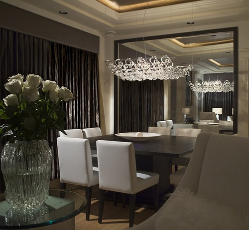 Coloca uno o dos espejos en la pared, a la altura de las sillas, para agrandar ilusoriamente el comedor. Podremos encontrar espejos con diseños modernos, clásicos, simples, extravagantes, etc. donde se puede elegir los que más le convenga.