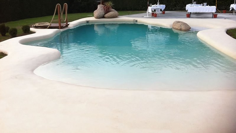 Las piscinas de arena se construyen con materiales 100% de apariencia natural consiguiendo un efecto realmente parecido a tener una playa en casa. Con base de hormigón gunitado armado e impermeabilizado, revistiéndose después con un acabado de arena de alta resistencia a la intemperie, adherido al soporte de hormigón que da el aspecto visual de arena de playa, y que, además, es altamente antideslizante tanto en seco como en mojado.