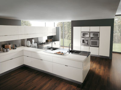 La cocina en U está dispuesta formando una silueta semejante a la de ésta letra, en tres frentes continuados, y unidos por dos módulos de esquina. Este tipo de cocinas es una de las más utilizadas, pues la mayoría de los hogares no disponen de los metros a su antojo, y esta solución permite aprovechar al máximo el espacio.