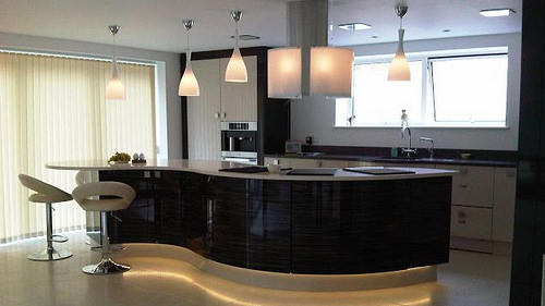 Las tendencias actuales en el diseño de cocinas modernas incluyen maravillosos diseños con islas curvas brindando mayor comodidad para cocinar y ganar a la vez espacio de tránsito adicional.