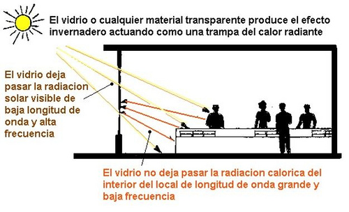 Los vidrios de las ventanas actúan como una trampa de calor dado que dejan pasar la luz solar, pero la radiación calórica no visible que emiten a su vez los objetos, no pasan. A esto de denomina efecto invernadero, tal cual se detalla en el esquema anterior.