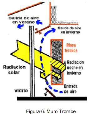 Por otra parte, el aire se calienta entre el espacio entre el vidrio y el muro, circulando por convección natural dado que al estar más caliente se hace más liviano, circulando desde la parte inferior hacia la superior del local. A su vez el calor almacenado en el muro se transmite a la parte interior por conducción calentando la pared y emitiendo ese calor almacenado al interior del local.