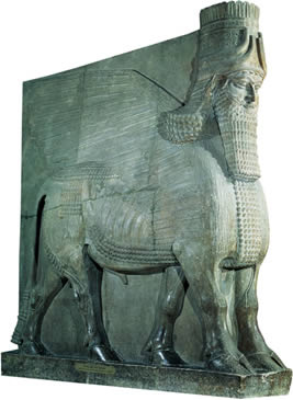 Junto a las puertas principales de los palacios reales, como para defender la entrada o simbolizar el poder, había colosales figuras de esfinges aladas, a veces, de cinco metros de altura, que por lo común tenían cabeza de hombre (androsfinges) con barba rizada, el cuerpo de toro o de león y las alas de águila, esfinges que, por otra parte, ya habían empezado a usarse en el arte caldeo primitivo. Entre los motivos ornamentales se hallan muy habitualmente las grecas, piñas, palmetas, rosones, las acciones guerreras y las cacerías.