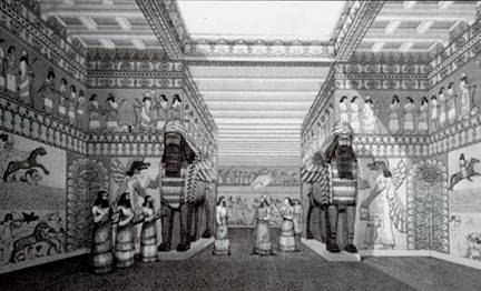 Los palacios asirios encierran en su perímetro grandes patios, alrededor de los cuales se alzan los cuerpos de edificio divididos en diferentes salas de extraordinaria longitud cuyas paredes interiores más ricas y a veces incluso los pavimentos se cubrían hasta cierto punto con láminas de alabastro, adornadas en los muros con relieves historiados e inscripciones y más arriba se revestían los muros con ladrillos esmaltados o azulejos que ostentaban hermosa pintura policromada.