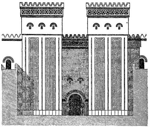 El bronce y el oro abundaban así mismo en estas decoraciones palatinas. Es lo más probable que no tuvieran los palacios más que un solo piso y que recibieran la luz por el techo el cual se hacía plano y se adornaba con madera esculpida. Junto al palacio real se elevaba la torre-templo.