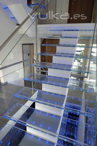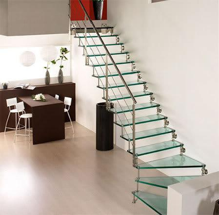 Las escaleras de vidrio o cristal combinan técnica, imagen y diseño. Son livianas, etéreas y transparentes. Son muy usadas en arquitectura comercial e industrial. Las escaleras de cristal suponen un sutil y elegante maquillaje: confieren ligereza a la sala y al subir en ellas nos da la sensación como si estuviéramos flotando en el aire. Estas escaleras pueden ser rectas, con giros y rellanos, curvas o helicoidales.