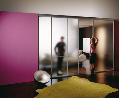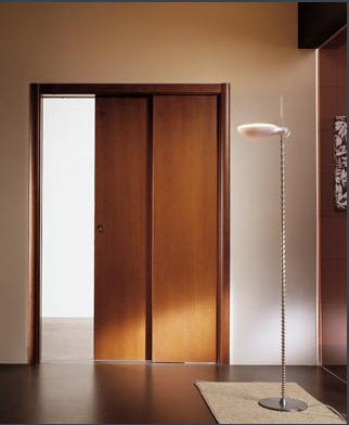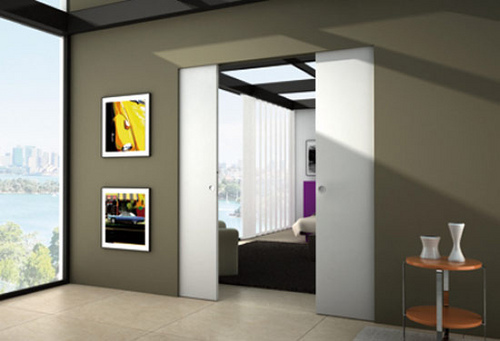 Una puerta sencilla se oculta entre el hueco existente entre dos tabiques, o se apoya sobre la pared a través de la guía.