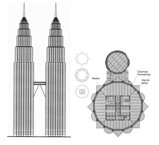 la construccion de la torres petronas necesitó 16 pilares de concreto, cada uno midiendo 19 pies (5.8 m) de grosor, para ir con la longitud de las torres. Enlazados por una serie de vigas, los pilares podían soportar 270,000 toneladas.
