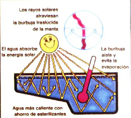 El sistema más habitual es el llamado cobertor de burbujas. El cobertor flota sobre el agua de la piscina concentrando la energía de los rayos del sol sobre la superficie del cobertor, pudiendo llegar a conseguir un aumento de la temperatura de 4 ó 5 grados.