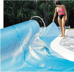 Los cobertores o manta solar de piscina estan hechos de polietileno de 400 micras y habitualmente viene en color azul; todo su conjunto es soldado y sus refuerzos cocidos; se debe colocar sobre la superficie del agua (las partes de las burbujas hacia abajo mientras que la parte lisa debe estar visible). Una vez que la temperatura del agua haya alcanzado los 28ºC, la manta solar debe quitarse mediante el uso de un enrollador; en caso de no contar con uno, lo que se debe hacer aquí es enrollarla y dejarla bajo la exposición de la sombra.