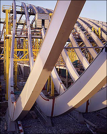 La geometría idiosincrásica del edificio radica en el hecho de que la sección de los arcos de acero está ligeramente inclinada, pero siempre en diferentes ángulos. Los arcos son tensados por puntales a compresión directamente integrados en la estructura del tejado para impedir que los arcos se inclinen hacia atrás. Las extremidades de los arcos de acero son comprimidas juntas con la ayuda de ligaduras que están conectadas con el suelo y con las losas del suelo para evitar que los arcos de acero se deslicen de su base. Cada una de las vigas de acero curvado, con pesos diferentes, ha sido construida individualmente.