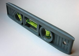-Nivel de burbuja: Es el más tradicional. Puede ser de madera o metal, pero, en cualquier caso, su forma es alargada y tiene dos ampollas de cristal, una en sentido longitudinal, para señalar la horizontalidad, y la otra en sentido transversal, para marcar la verticalidad. Según para qué trabajos, conviene utilizar un nivel de burbuja bastante largo, ya que logrará alineaciones más precisas.