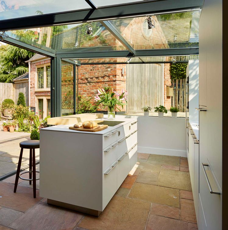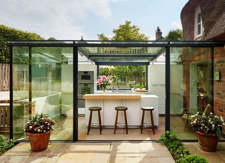 La idea era crear una caja de cristal que no cambiase el aspecto original de la casa, pero que a su vez le diese un aire de diseño exclusivo. La ampliación de vidrio alberga la nueva cocina de la casa, con mucho más espacio para almacenaje e incluso para taburetes y banquetas.