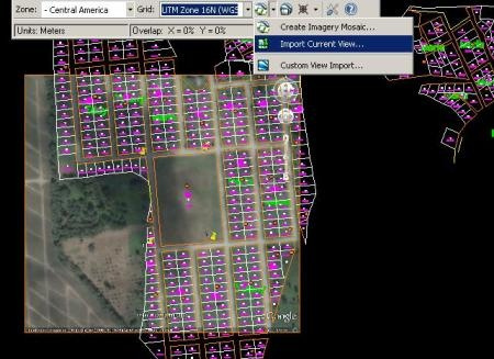 Importar vista actual de Google Earth.  Esto es con el primer ícono, en Import current view, y lo que hace es ir a Google Earth, copiar un printscreen, obtener el extent y traerla como imagen.  Interesante, mejor que la herramienta que ya trae AutoCAD pues se viene en colores, con una mejor resolución y como usa tres puntos de control (no uno como AutoCAD) se viene tal como se pidió.