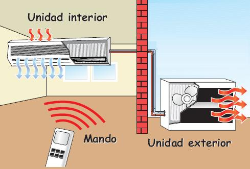 El Aire Acondicionadp tipo Split es un equipo de climatizacion conformado por dos unidades separadas, una interior (con evaporador, ventilador, filtro de aire y sistema de control) y otra exterior (con compresor y condensador). Ambas unidades se comunican entre si mediante tuberias.