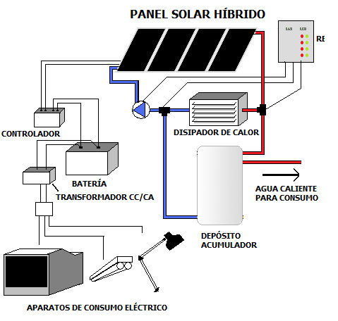 Con el Panel Solar Híbrido, el calor existente en las células fotovoltaicas, que era un problema, es aprovechado y transferido mediante un fluido calorportador a un acumulador solar para proporcionar calor. La electricidad generada se almacena en un banco de baterías. Con este sistema conseguimos aumentar la producción de electricidad un 15% y reducir el espacio necesario para instalar ambos tipos de energías. Como puede deducirse se obtiene simultáneamente energía eléctrica y energía térmica útil.