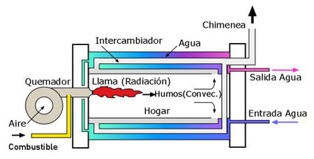 El principio básico de funcionamiento de las calderas de calefacción, consiste en una cámara donde se realiza la combustión, con la ayuda del aire comburente y a través de una superficie de intercambio se realiza la transferencia de calor al agua. Los componentes principales que lo conforman son: Hogar, quemador, chimenea, fluido caloportador, y el intercambiador.