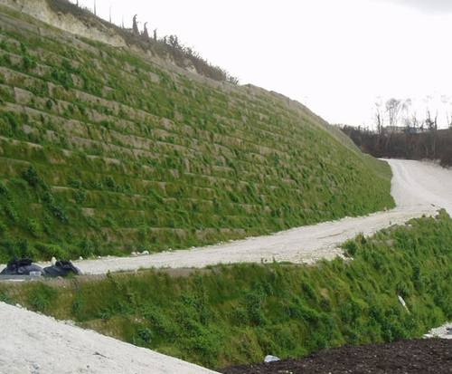 El panel posterior, termina y el diafragma de la seccion esta conectado a la unidad principal durante el proceso de manufactura. La seccion frontal es una forma rectangular llena con rocas que le proporcionan fuerza y drenaje a la estructura. Fomentar la vegetacion puede ser usada como se muestra en la imagen siguiente.