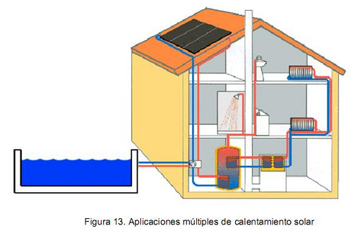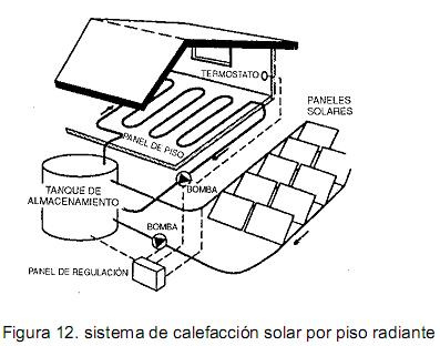 Los sistemas con colectores de agua caliente solar pueden aplicarse a distintos sistemas de calefacción, pudiéndose mencionar pisos radiantes, radiadores, aire caliente, fan-coil,etc. En la figura anterior se observa un esquema básico de calefacción solar por piso radiante