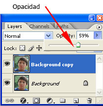 La opacidad está localizada en la paleta de capas en la parte superior derecha y al dar clic sobre el número, que por defecto viene en 100%, aparece un puntero donde podemos deslizarlo hacia la izquierda para ir reduciendo la opacidad.