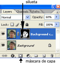 Al dar clic aparece un pequeño rectángulo blanco enlazado con la capa en que estamos trabajando en la paleta de capas. Esto quiere decir que la máscara de capa está activa.