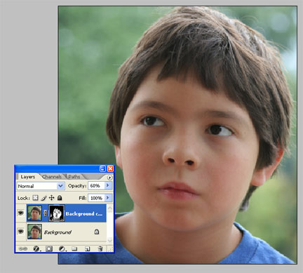 Luego movemos la opacidad de la capa hasta que se suavice la piel y desaparezcan las imperfecciones, aunque el pelo, los ojos, dientes y el fondo estén un poco borrosos.