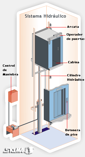 El esfuerzo del transporte no carga sobre la estructura de la construcción y el desgaste de la maquinaria es menor dado que todo el sistema funciona mediante aceite que es inyectado por una bomba a presión. Este tipo de ascensor es muy seguro en los casos de cortes de energía eléctrica ya que puede ser descendido manualmente quitando presión al al equipo mediante una sencilla válvula.