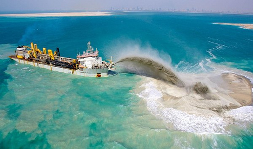 Las famosas islas Plameras en Dubai deben su existencia en gran medida a una maquinaria encargada de lanzar chorros de arena, llamada Barcos Dragadores. El dragado es la operación de recogida de materiales situados bajo el agua. Dicha operación es llevada a cabo por plataformas especializadas en dicha tarea, conocidas como dragadoras. El dragado es utilizado con diferentes propósitos, tales como la recogida de material del fondo o bien crear artificialmente mayores profundidades en un area determinada.