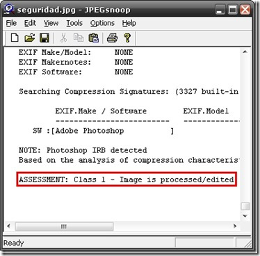 Damos en abrir para examinar la imagen que queremos indagar. De inmediato nos muestra el informe y entre tanta informacion lo unico que nos interesa es la ultima parte que dice ASSESSMENT. Como se puede ver en la imagen la foto que abre ha sido editada segun el programa. Tambien unos renglones arriba, dice que Photoshop fue el programa utilizado para editar la foto.