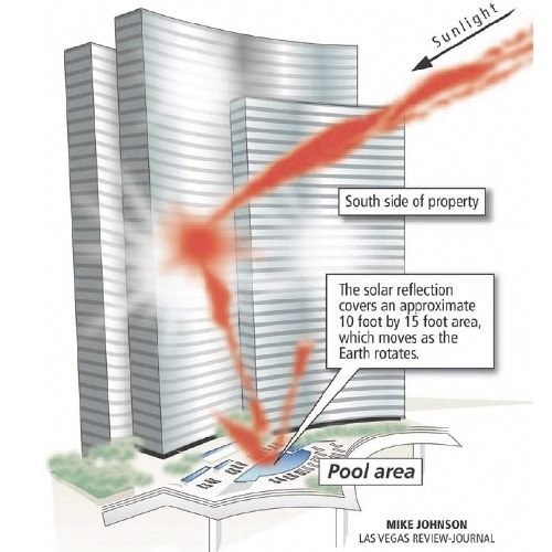 Un diseño arquitectonico moderno esta siendo el causante de que huéspedes del hotel Vdara en Las Vegas, Estados Unidos, presentaron graves quemaduras en su cuerpo por los fuertes rayos del sol que golpean la piscina del hotel. El ‘rayo de la muerte de Vdara’, llamado así por los empleados del hotel, es provocado por el diseño del edificio, donde la superficie de cristal de su fachada curvada refleja el sol hacia la zona de la piscina en las horas centrales del dia. El sol es tan fuerte que “puede quemar el cabello y derretir vasos y bolsas plásticas”, según un diario local.